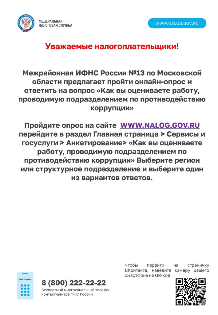 Межрайонная ИФНС России №13 по Московской области предлагает пройти онлайн-опрос.