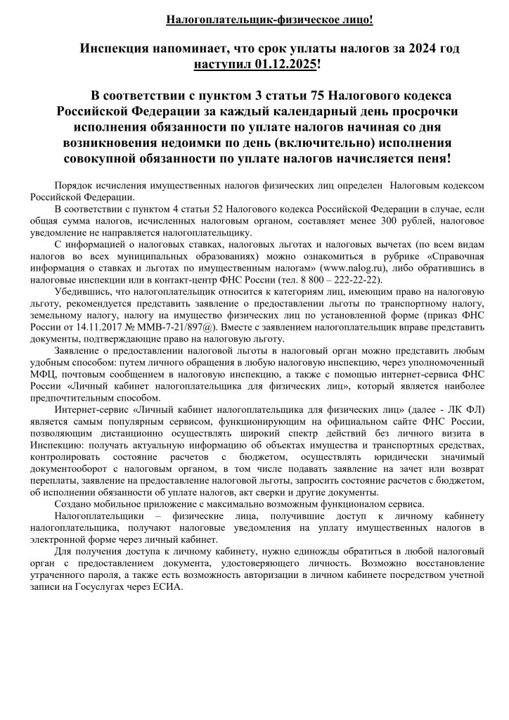 Налогоплательщик-физическое лицо, налоговая инспекция напоминает, что срок уплаты налогов за 2024 год наступил 01.12.2025!