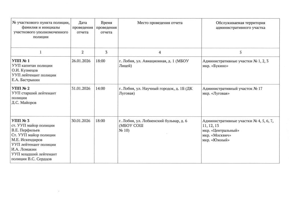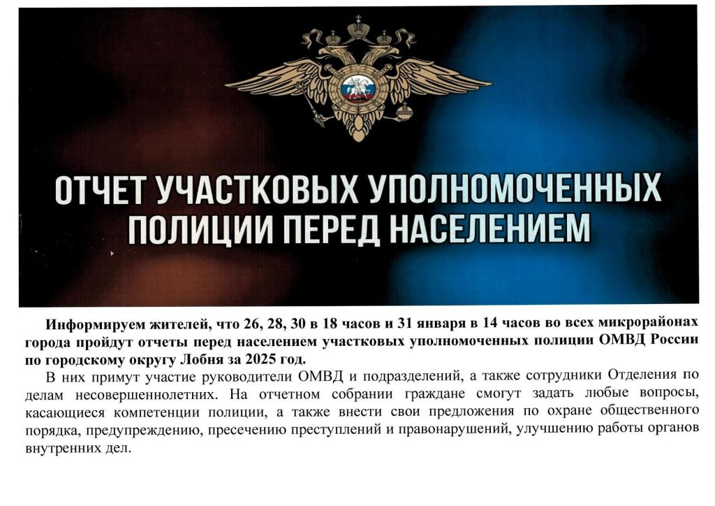 ОМВД России по городскому округу Лобня информирует о представлении отчета за 2025 год участковыми уполномоченными полиции перед населением.