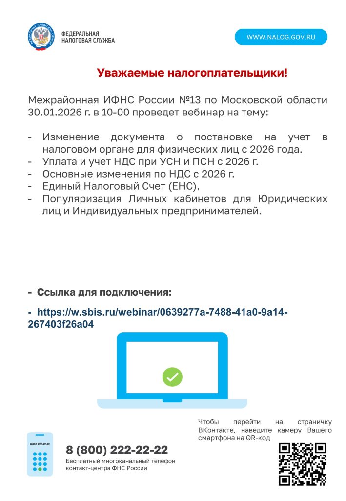 Межрайонная ИФНС России №13 по Московской области приглашает вас на вебинар, на котором рассмотрит важные изменения 2026 года.