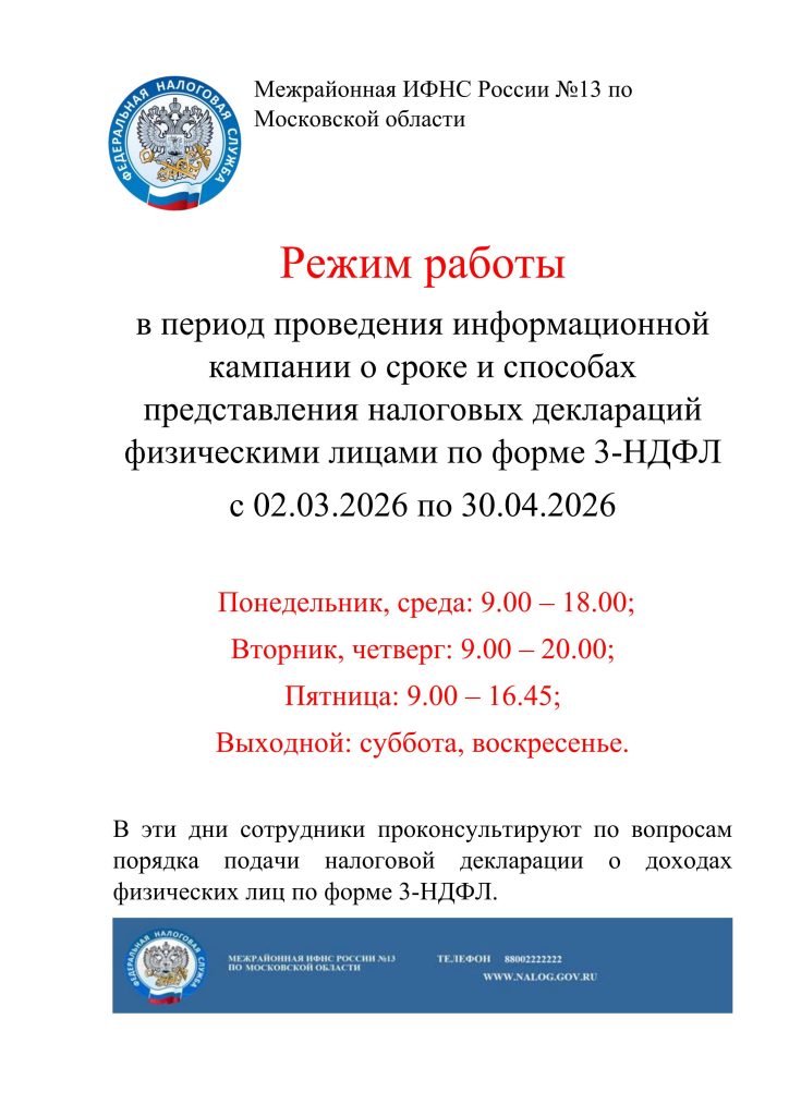 Внимание! График консультаций для физических лиц в Межрайонной ИФНС России №13 по Московской области